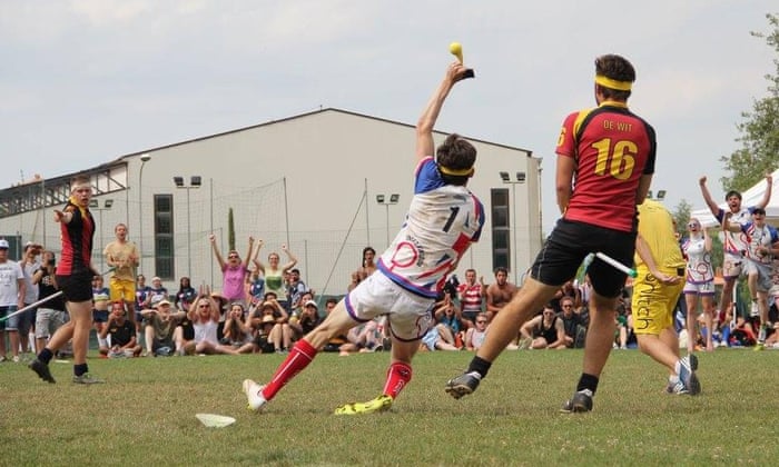 Este ano, a competição, agora chamada de Copa do Mundo IQA, acontece em Frankfurt, 23 e 24 de julho, com 25 países concorrentes, do Paquistão ao Uganda, Coréia do Sul e Peru . Cada equipe tem 21 atletas, com sete jogadores por vez no campo, cada um com uma vassoura entre as pernas. Há um guardião, que guarda os aros; Três caçadores, cuja tarefa é lançar um voleibol semi-desflastado conhecido como uma quaffle através dos aros; dois batedores, que jogam bludgers (dodgeballs) na equipe adversária para "eliminá-los" e um buscador, que tenta pegar o snitch ", uma meia com uma bola de tênis, amarrada ao short do corredor de snitch". Uma vez que o snitch é pego, o jogo termina.Facebook Twitter Pinterest Este ano, a equipe de quidditch ugandense será a primeira equipe africana a jogar na Copa do Mundo. Fotografia: Matthew Guenzel